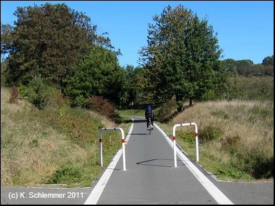 Dann erreicht man die Bahnhofstraße. Der Radweg verschwenkt nach rechts und folgt der Bahntrasse auf einem asphaltierten Weg.
