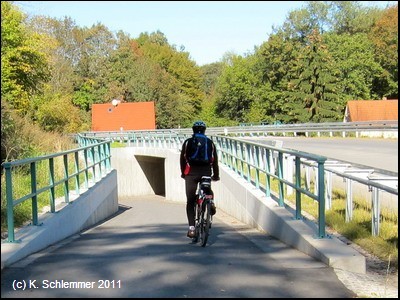 Die Bundesstraße 7 hat die Bahntrasse unterbrochen. Der neue Radweg folgt der Straße zum Bahnhof Eisenberg-Ost. Durch eine Unterführung gelangt man auf die andere Straßenseite.