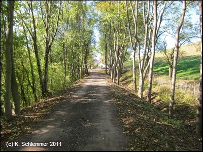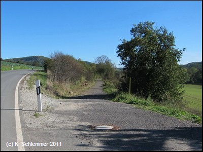 Am Ort vorbei hat man ein kleines Stück Trasse asphaltiert. Danach, über die Felder und am Straßenrand entlang, ist es nur noch ein schmaler Pfad.