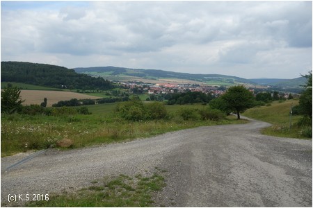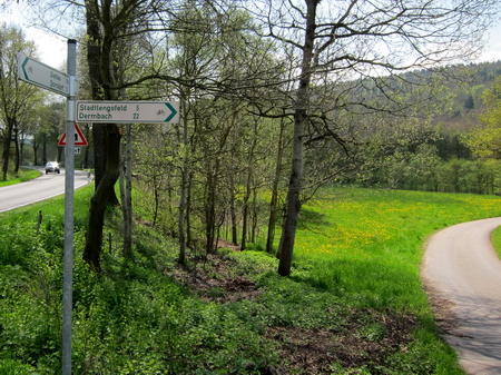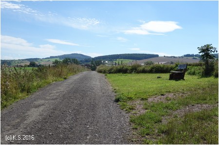 Am südlichen Ortsende von Kaltensundheim stehen wieder Wegweiser. Über die Brücke, dann auf einem Feldweg links den Berg hinauf.