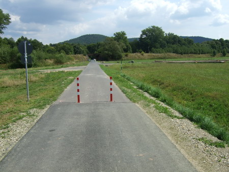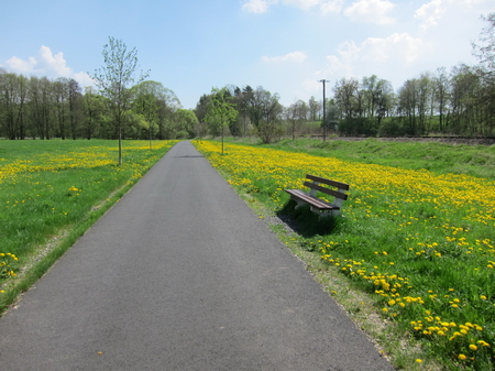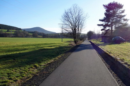 Kerzengerade geht es auf asphaltiertem Weg durch die Wiesen entlang der stillgelegten Trasse.