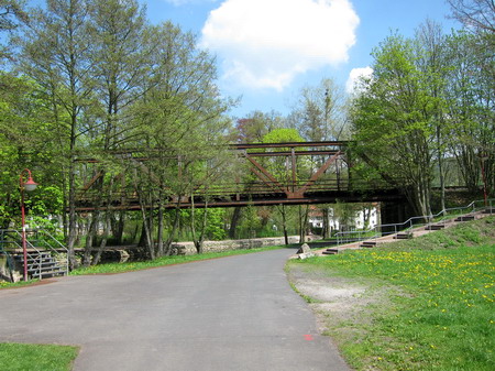 Unter der großen Stahlgitterbrücke der Feldabahn hindurch.