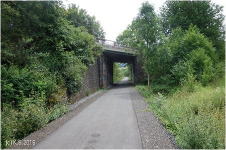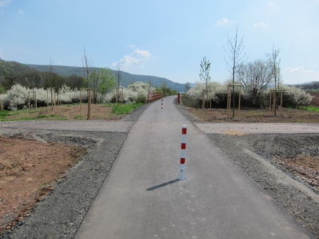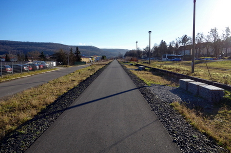 Nach der Straßenkreuzung am Bahnhof Zella wurde 2017 der Radweg auf der Trasse fertiggestellt. Rechts oberhalb am Hang liegt der Ort Zella mit der Probstei und der Kirche.