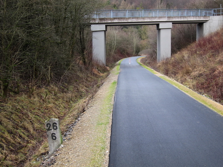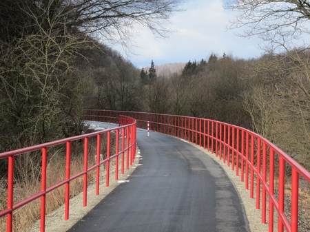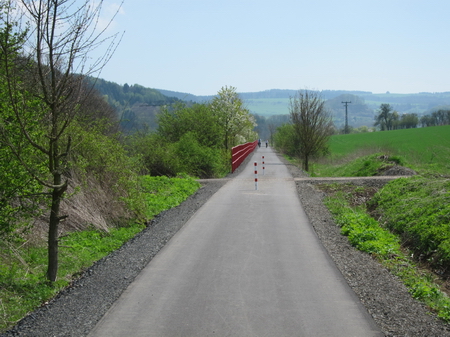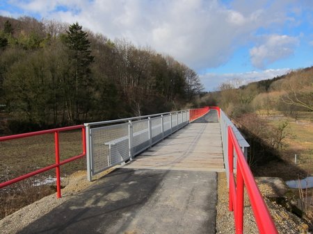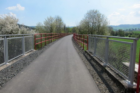 Der Radweg folgt weiter der Trasse und der Felda aufwärts. Rote Geländer begrenzen den Radweg an den steilen Flanken. Leider gibt es auch hier wieder Pfostensperren. Die Brücke über die Felda wurde von Grund auf erneuert.