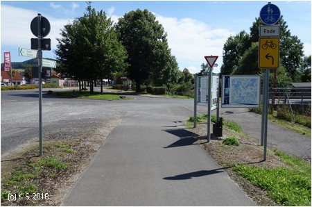 Der Radweg auf der Bahntrasse endet hier. Die Beschilderung des Feldtalradwegs führt die Radler weiter nach Kaltensundheim.