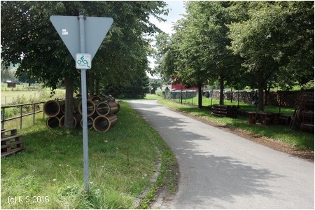 Am ehemaligen Bahnhofsgelände endet der Ausbau des Bahntrassenradwegs. Geradeaus weiter steht ein kleiner Wegweiser in Schieflage am Wegesrand - leicht zu übersehen.