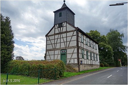 An der Straße in Weimarschmieden ein Schilderwald - Gleich zwei Wegweiser nach Fladungen, kein Hinweis mehr auf den Feldatalradweg. Die kleine evangelische Kirche stammt aus dem Jahr 1804.