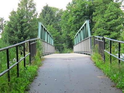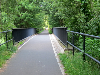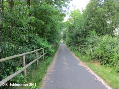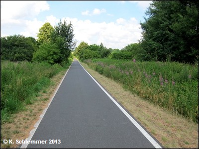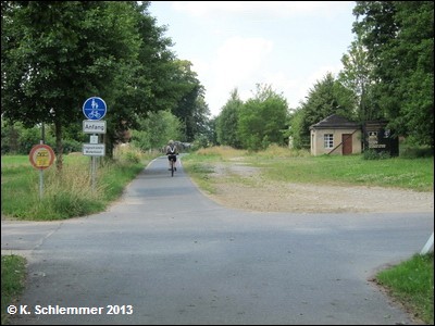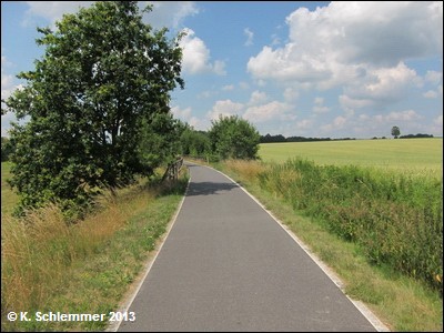 Noch vor der B6 kreuzt die Bahnlinie nach Cottbus, hier zweigte die Görlitzer in westlicher Richtung ab. Nach 600 m Radweg, unter der B6 hindurch, erreicht man den Beginn des schön ausgebauten Radwegs auf der Trasse.