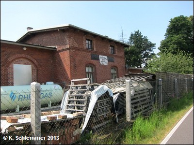 Einfahrt in den Bahnhof Königshain-Hochstein an der großen Verlademauer entlang: Hier wurden Schüttsteine (Pflaster-, Mauersteine) über fahrbare Rutschen verladen.