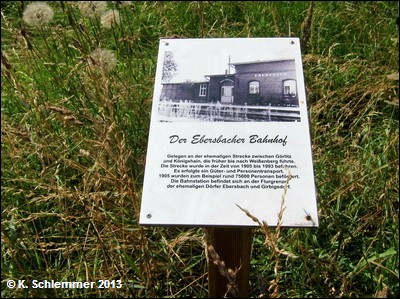 Ein Schild erzählt die Geschichte des Bahnhofs. Es folgt eine Brücke über das "Königshainer Wasser".
