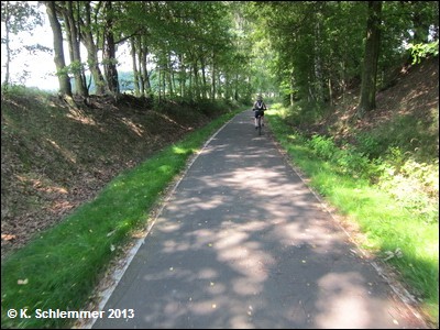 Wie durch einen grünen Tunnel rollt man dahin, eine Informationstafel zum Radweg steht am Streckenrand.