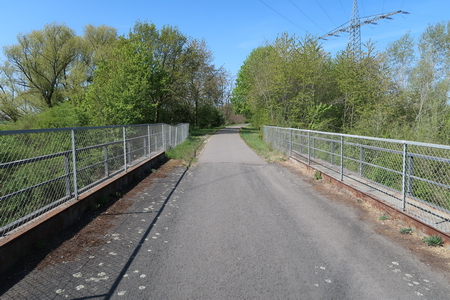 An der Straße entlang führt ein gut ausgebauter Radweg, geschützt durch die Leitplanke. Hier, vor dem früheren Gasthof Rischenkrug, kreuzte die Bahnstrecke die Straße.