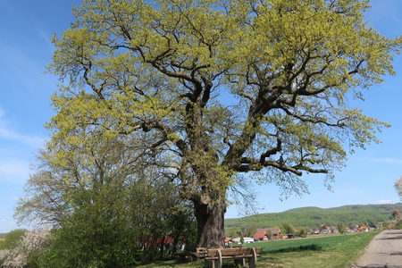 Der beschilderte Radweg führt durch den Ort und verlässt nun den Verlauf der Bahnstrecke. An einer uralten Eiche vorbei folgt man dem Weg durch die Felder, der bald nach rechts hinab ins enge Tal der Schede abzweigt.
