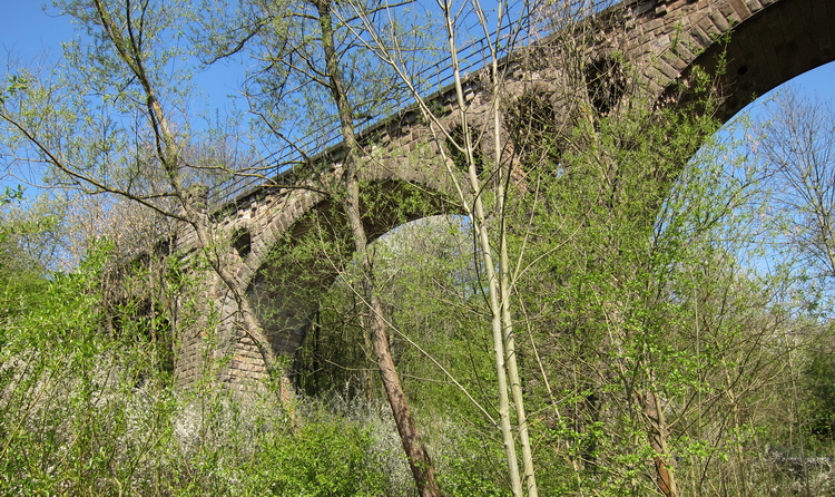 Blick auf die verlassene Bahnstrecke und das Viadukt, das noch gut erhalten zu sein scheint.
