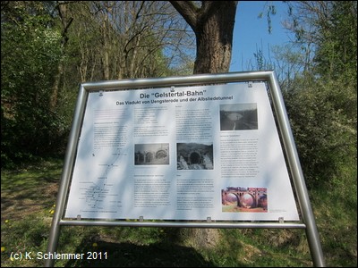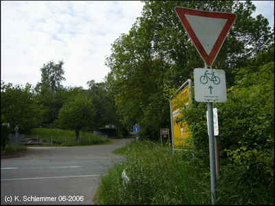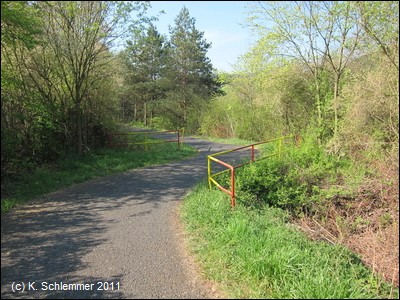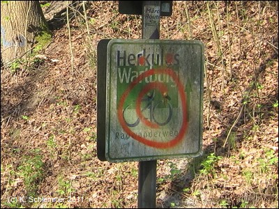 Vorbei an zwei Durchlässen folgen wir der Bahnstrecke. Der Radweg ist Teilstrecke des Herkules-Wartburg-Radwegs, auch wenn die Schilder so verschmutzt sind, dass man sie kaum noch lesen kann (2011)