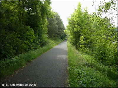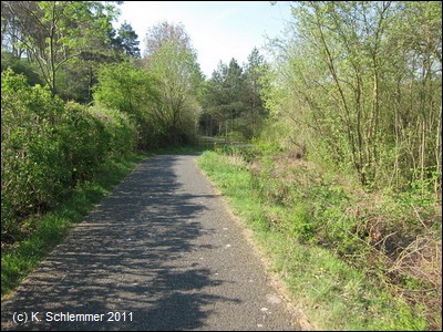 Leicht bergauf und wieder bergab folgt der Radweg der alten Bahnstrecke, die rechts des Radwegs brach liegt.