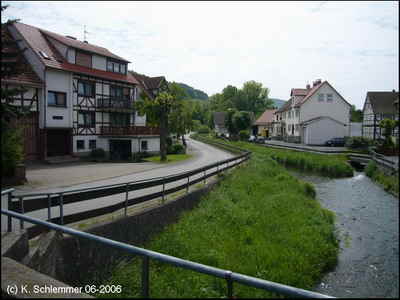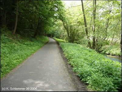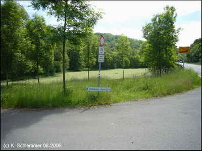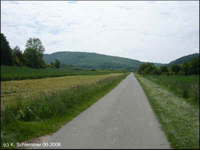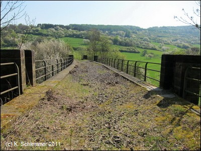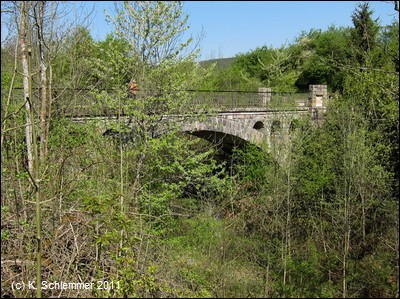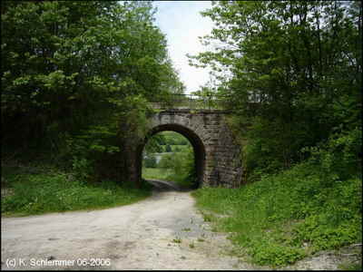Ein kurzes Stück an der Straße entlang, dann wieder links zum Bach hinab (gut beschildert!). Dann verlässt der Radweg den Verlauf der Bahnstrecke. Wer zum Viadukt will, muss geradeaus weiterfahren, durch das Tal des Laudenbach Richtung Uengsterode.