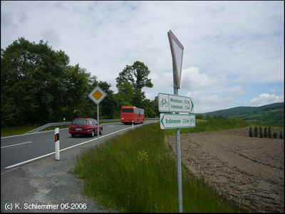 Folgt man dem Wirtschaftsweg weiter, geht es auf schlechter Wegstrecke über die Kuppe und weiter bis zur Bundesstraße etwas westlich der Erbsmühle. Ab hier habe ich keine akzeptable Alternativstrecke gefunden, ca. 2,5 km sind es noch bis Großalmerode, die Hälfte davon muss man auf der Bundesstraße 451 fahren: das ist unbefriedigend und gefährlich.