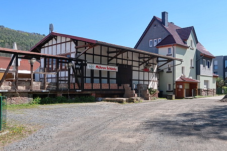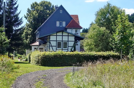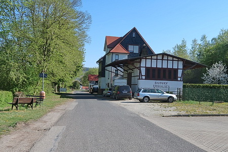Nach Verlassen des Waldes nähert man sich dem Bahnhof Dieterode, heute als privates Wohnhaus genutzt. Weit oberhalb liegt die Abbruchkante des Muschelkalks der Dieteröder Klippen. Von dort oben erkennt man das ehemalige Bahnhofgebäude weit unten am Radweg.