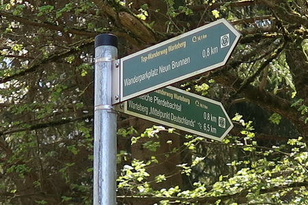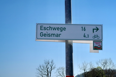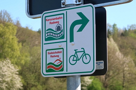 Die neuen Wegweiser des Südeichsfeld-Radwegs stehen an der Straße vor dem Bahnhof. Es geht durch das Pferdebachtal hinauf nach Kalteneber und Fürstenhagen auf der Trasse der alten Bahnstrecke.