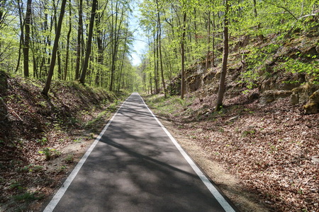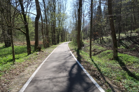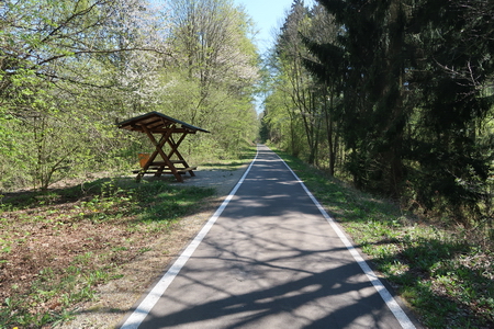 Am Rande des Radwegs findet man hin und wieder überdachte Rastbänke. Trotz des für eine Bahnstrecke recht kräftigen Anstiegs ist die Fahrt durch den Wald ein Genuss.