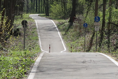 Der Weg auf der Trasse ist gut fahrbar, aber die Fahrt ist nicht von langer Dauer. Die Trasse ist zu Ende, die Beschilderung führt zum Radweg entlang der Straße.