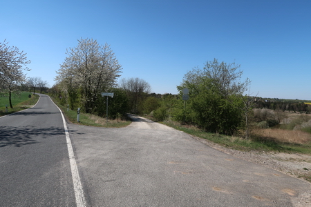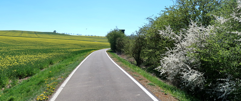 Am östlichen Ortsende von Krombach biegt der neue Südeichsfeldradweg nach rechts ab auf einen Feldweg. Ein kurzer kräftiger Anstieg führt auf der recht ruppigen Piste hinauf auf den Hügel.