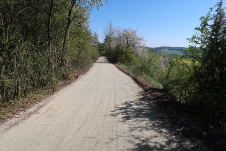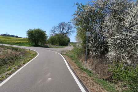 Der Feldweg führt nun hinab ins Tal und tifft dort südlich von Martinsfeld auf die Landstraße. Die steile, steinige Strecke ist alles andere als ein Radweg (Stand 2020), hier müsste dringend nachgebessert werden!