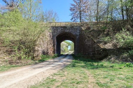 Wer der alten Bahntrasse folgen will, muss nach der Brücke rechts abbiegen und am zugewachsenen Einschnitt entlang, dann dem Pfad auf der Trasse folgen. Die Route war 2020 zugewachsen und für Normalradler nicht geeignet. Die neu beschilderte Wegführung durch den Ort führt durch die Felder weitab der Bahntrasse nach Ershausen.