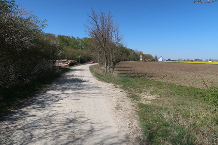 Durch das Industriegebiet, dann an den Feldern entlang Richtung "Neun Brunnen" führt der neue Radweg, der in diesem Abschnitt noch nicht die alte Bahntrasse nutzt. Schon bald ereicht man den Waldrand.