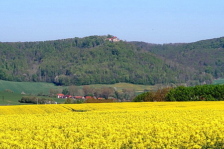 Weit jenseits der Rapsfelder liegt die Burg Gleichenstein auf einem Bergrücken.