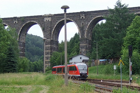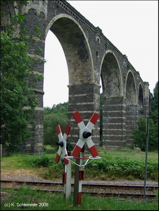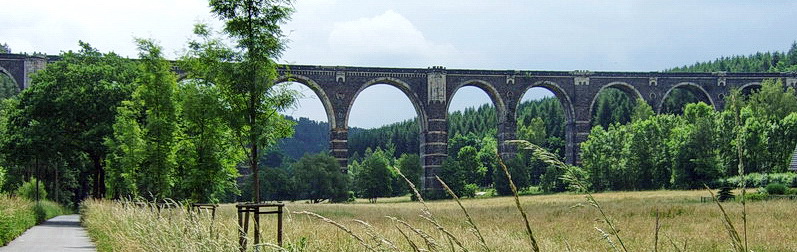 Das riesige Viadukt beschreibt eine Kurve von 328 m Länge in 43 m Höhe über das Flöhatal, die Aussicht ist grandios.