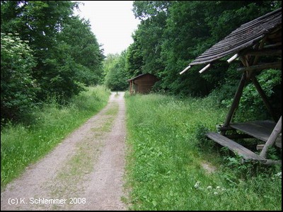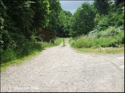 Einen kurzes Wegstück bergauf, dann ist man auf der ehemaligen Bahntrasse. Eine Schutzhütte am Ende des Weges, vorbei an den Pfostensperren geht es unmerklich bergauf Richtung Viadukt.