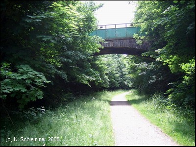 Spätestens jetzt ist die Bahnstrecke nicht zu übersehen: eine alte Brücke überspannt den Einschnitt.