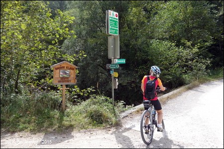 Hier beginnt der Rundkurs. Wir fahren zunächst rechts ab am Großen Bach entlang zur "Großen Klause" - geradeaus führt die Trasse nach Brunnbach.