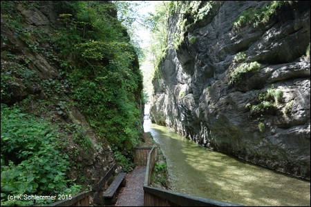 Schließlich erreicht man den "Schleierfall". Steile Felswände ragen neben dem Radweg auf (Blick zurück).