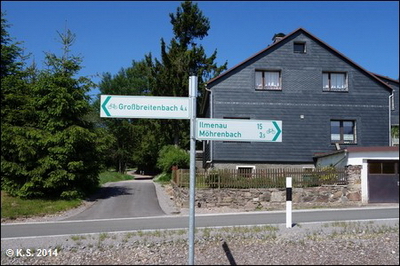 ...denn die folgende Bahnbrücke über die Ilm ist gesperrt. Am Abzweig folgt man der Beschilderung Richtung Langewiesen. Der Ilm-Rennsteig-Radweg verläuft hier noch zusammen mit dem Ilmtal-Radwanderweg flussabwärts. Das Logo des Ilm-Rennsteig-Radwegs fehlte aber 2014 noch.