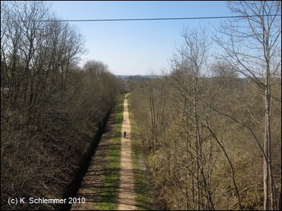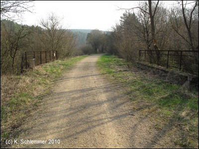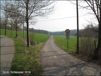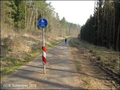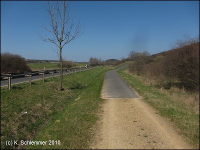 Am westlichen Ende der Stadt, "Im Hundspesch", geht es auf die Trasse. Der Radweg ist hier nicht asphaltiert und verläuft parallel zur B-421.