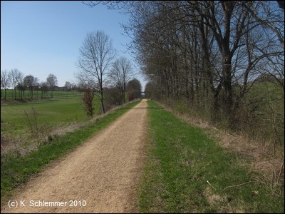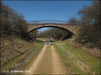 Der Radweg macht eine Schleife um den Ort, ein kurzes Stück ist asphaltiert. Es folgt ein unverkennbarer Bahntrassenweg.