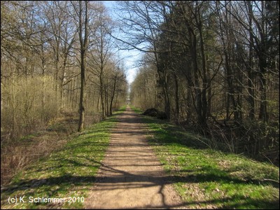 Ein kleines Wäldchen wird durchquert. Mehrere Brücken überkreuzen die Bahntrasse.