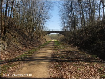 Am alten Bahnhof in Hillesheim. In einem tiefen Einschnitt führt die Schleife um die Stadt herum. (Blick von der Brücke Berndorfer Straße).