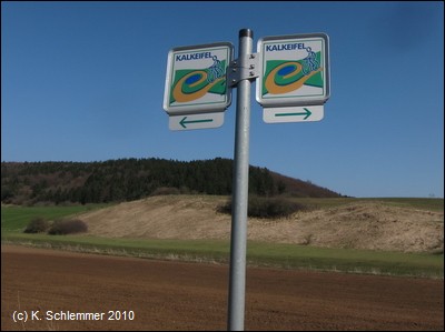 Am nördlichen Ende von Walsdorf kreuzt der Radweg die Kreisstraße K59 Richtung Kerpen. Die normgerechte Beschilderung mit dem Logo des Kalkeifel-Radwegs weist uns den Weg.