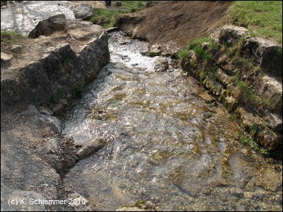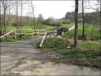 Doch schon beim Steinbruch Niederehe ist wieder Schluss mit der Bahntrassse. Nach dem Ort überqueren wir die Straße, passieren die Reste einer alten Brücke und folgen dem Niedereher Bach auf einem asphaltierten Wirtschaftweg.