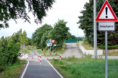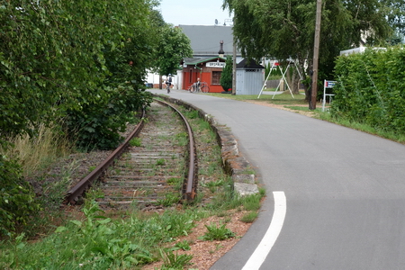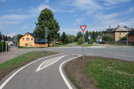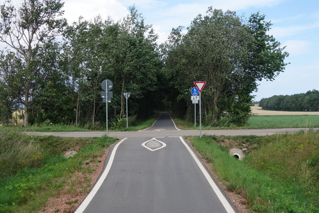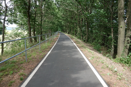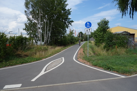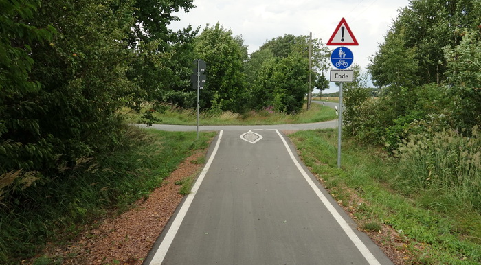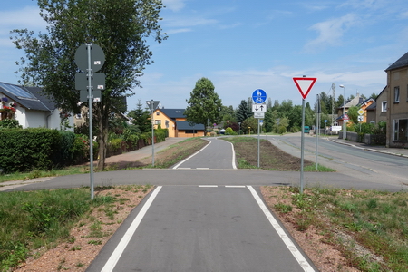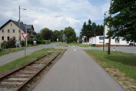 .....dann endet der Radweg an der Straße (Stand 2015). Nur etwa 1,5 km fährt man auf einer Asphaltstraße zum ehemaligen Haltepunkt Mittelbach (2015). Der weitere Ausbau auf der Trasse nach Mittelbach und Wüstenbrand soll folgen.