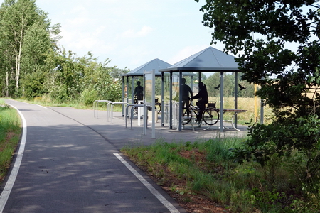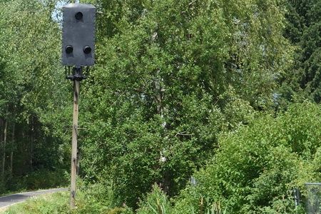 Ein gut erhaltenes Signal, dann ein moderner, überdachter Rastplatz am Rande der Strecke