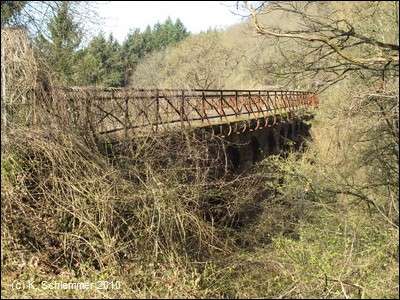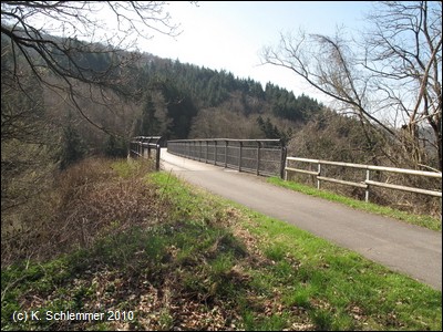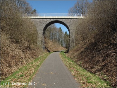 Wieder geht es unter der A1 hindurch, dann erreicht man den alten Bahnhof von Manderscheid-Pantenburg. Es folgt ein schönes Wegstück mit dieser tollen Brücke über einen Einschnitt.