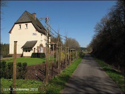 Nächster Halt ist der alte Bahnhof von Platten. Richtung Wittlich ist die Trasse durch Bauarbeiten unterbrochen, eine Umfahrung ist eingerichtet (Stand 2010).