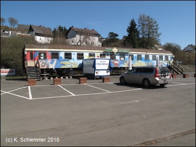...und der alte Waggon als Bistro. Von der Straße unterhalb aus hat man einen schönen Blick auf das große Viadukt.