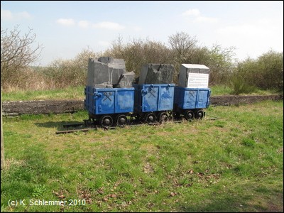 Am Haltepunkt Hausen stehen diese alten Loren mit Schiefergestein.