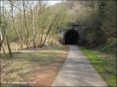 Dann kommt der erste (beleuchtete) Tunnel: Hausen 2, auf dem Schild am Portal steht: 252,95 m lang. Aus dem Tunnel heraus geht es über das Lehnen Viadukt (Blick Richtung Mayen), ein Bauwerk von 82,2 m Länge und nur 8 m Höhe.